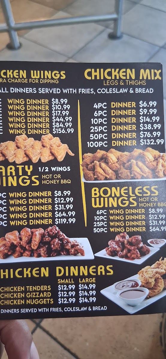 100 pcs dipped Buffalo hot or honey bbq. All dinners are served with fries , bread , cole slaw , mild and hot sauce..