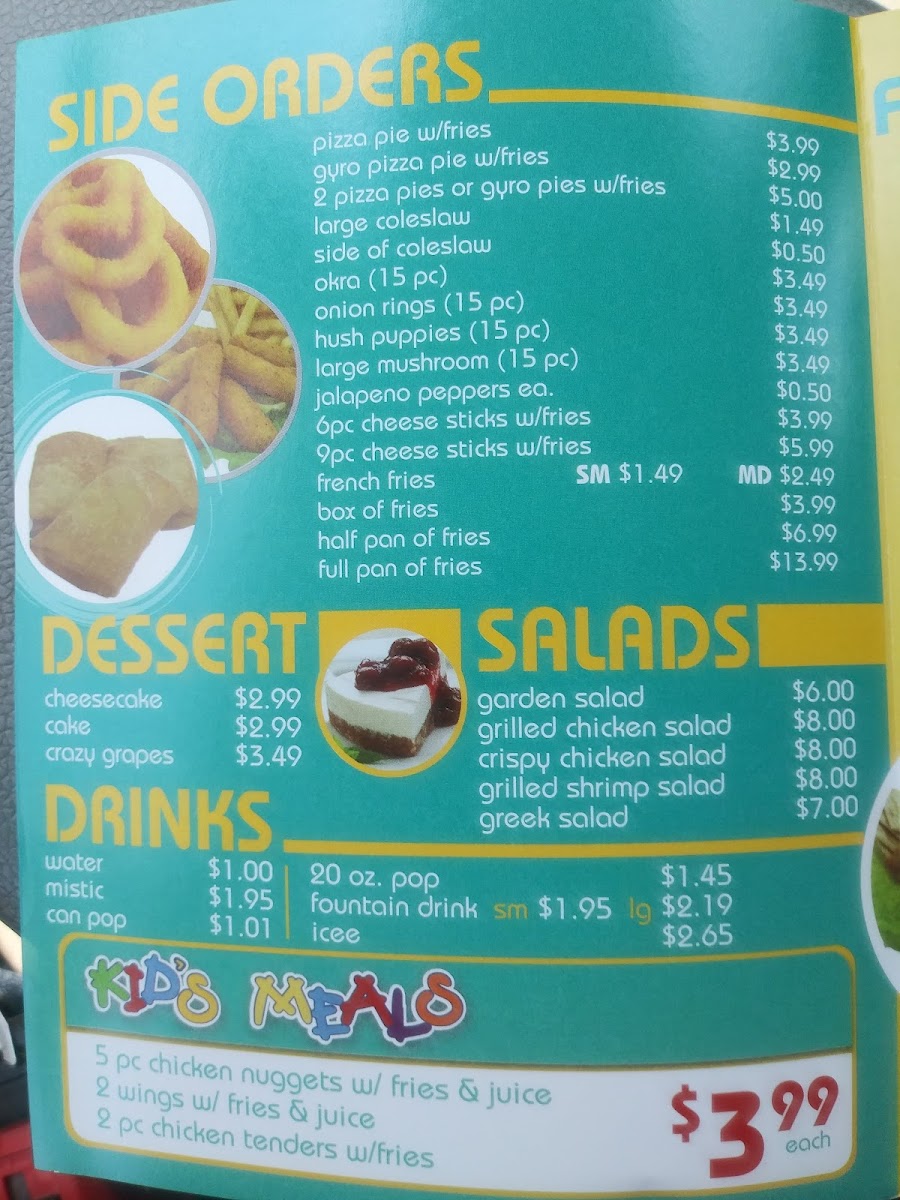 For a sweet treat, the Dessert options such as Home Made Banana Pudding, Cheesecake, and Crazy Grapes Cake are sure to satisfy your cravings. Kid-friendly choices are also available with meals like the Kid's 2 Piece Chicken Tenders and Kid's 5 Piece Chicken Nuggets.