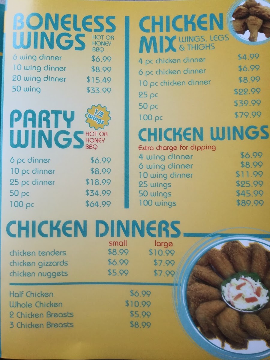 For those craving comfort food, the Chicken Dinners menu has a great selection, including Chicken Gizzards, Chicken Tenders, and Chicken Nuggets. The restaurant also features a wide range of Party Wings available in different quantities, such as 6 Pcs Party Wings, 10 Party Wings, and the more substantial 100 Party Wings. The crispy and flavorful wings make a perfect party or snack choice for sharing.