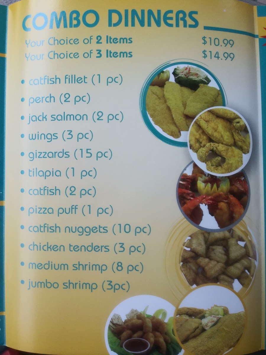 you can mix any 3 items catfish Fillet ( 1 pcs ) Jack salmon ( 2 pcs ) wings (3 pcs ) gizzards tilapia ( 1pcs ) catfish (2 pcs ) catfish nuggets chicken tenders ( 2 pcs ) medium shrimp (8 pcs ) All dinners are served with fries , bread , cole slaw , mild and hot sauce..