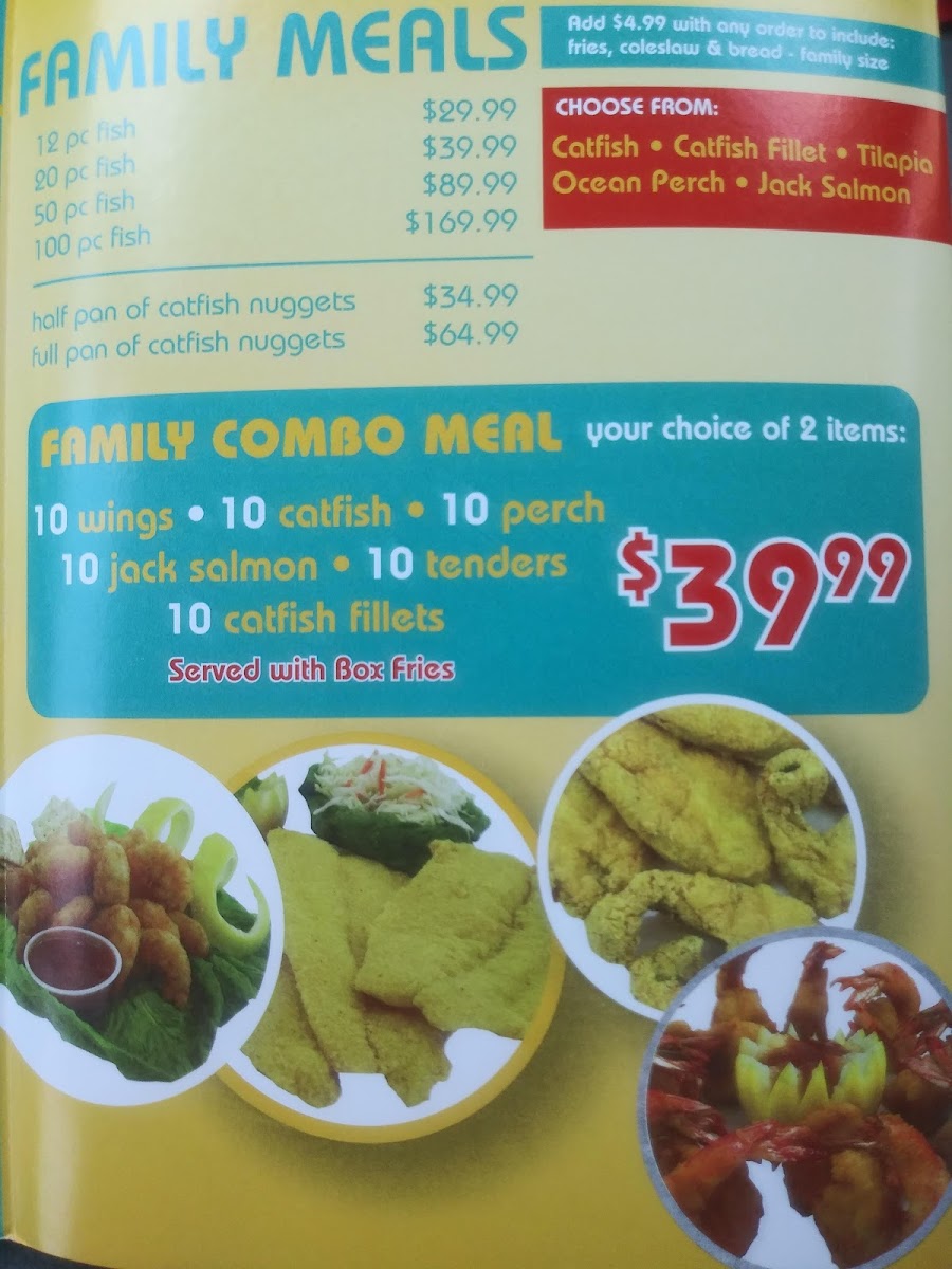 you can mix any 2 items catfish ( 10 pcs ) Jack salmon ( 10 pcs ) Tilapia ( 10pcs) Cat Fillet (10 pcs) Perch ( 10 pcs ) wings ( 10 pcs ) SERVED WITH FRIES, BREAD ,COLESLAW,MILD SAUCE,AND HOT SAUCE tilapia ( 10 pcs ) catfish ( 10 pcs ) chicken tenders (10 pcs ) medium shrimp (25 pcs ) All dinners are served with fries , bread , cole slaw , mild and hot sauce..